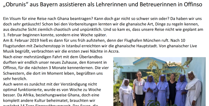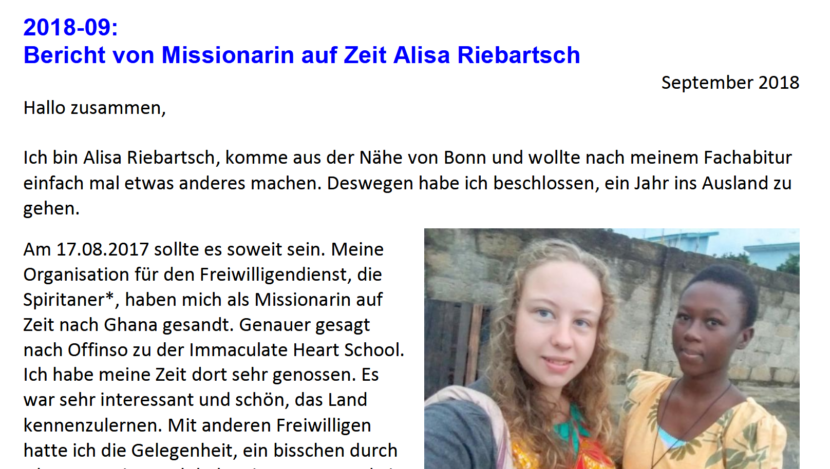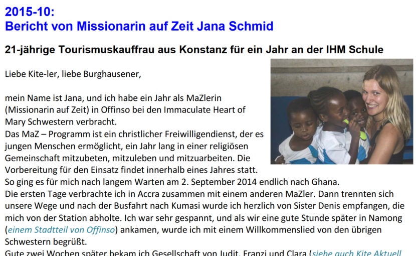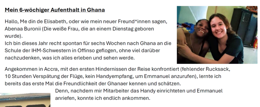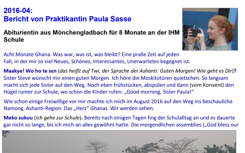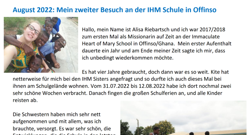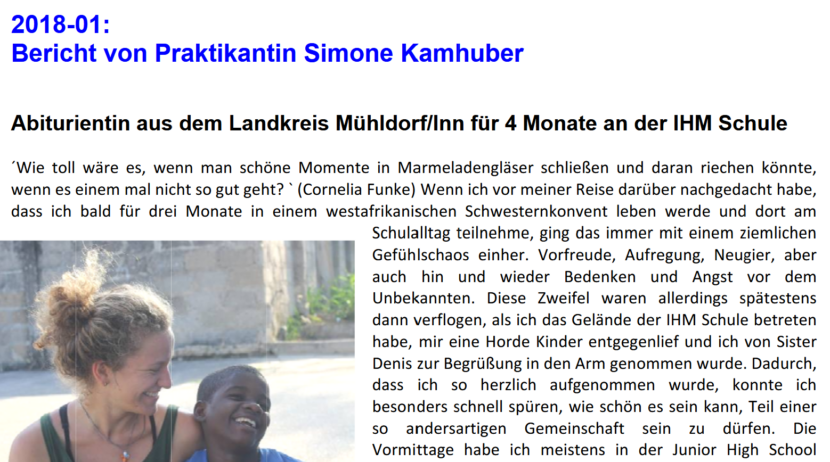 Von Zeit zu Zeit leben PraktikanntInnen oder MissionarInnen auf Zeit für mehrere Monate bei den IHM Schwestern. Sie helfen bei den Aufgaben in der Schule und im Internat und lernen das Leben vor Ort kennen.
